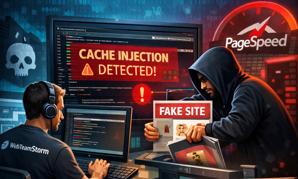 Взлому подвергся именно компонент PageSpeed, куда, с помощью манипуляций, был подброшен поддельный кэш, отдающий ложные страницы поисковикам. То есть сайты работали исправно и без сбоев, но отдельные URL возвращали поддельный контент. Было видно, что это временный кэш — PageSpeed со временем отбрасывал эти страницы, но толку мало, если они уже были скормлены индексаторам.