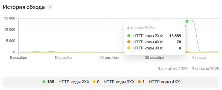 И вот, аккурат когда все отдыхают — наверное, на это и рассчитывал злоумышленник, — 5 и 6 числа на сайте было заиндексировано сразу по пять тысяч новых страниц. Яндекс и Google обрушились на сайт в поисках новых разделов, выбрасывая нормальные страницы и заглатывая фишинговые, жадно проглатывая их индексацией.