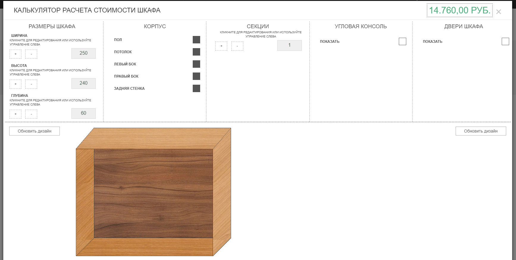 В качестве примера, ниже приведено изображение калькулятора, который позволяет пользователю с легкостью просчитать стоимость шкафа.